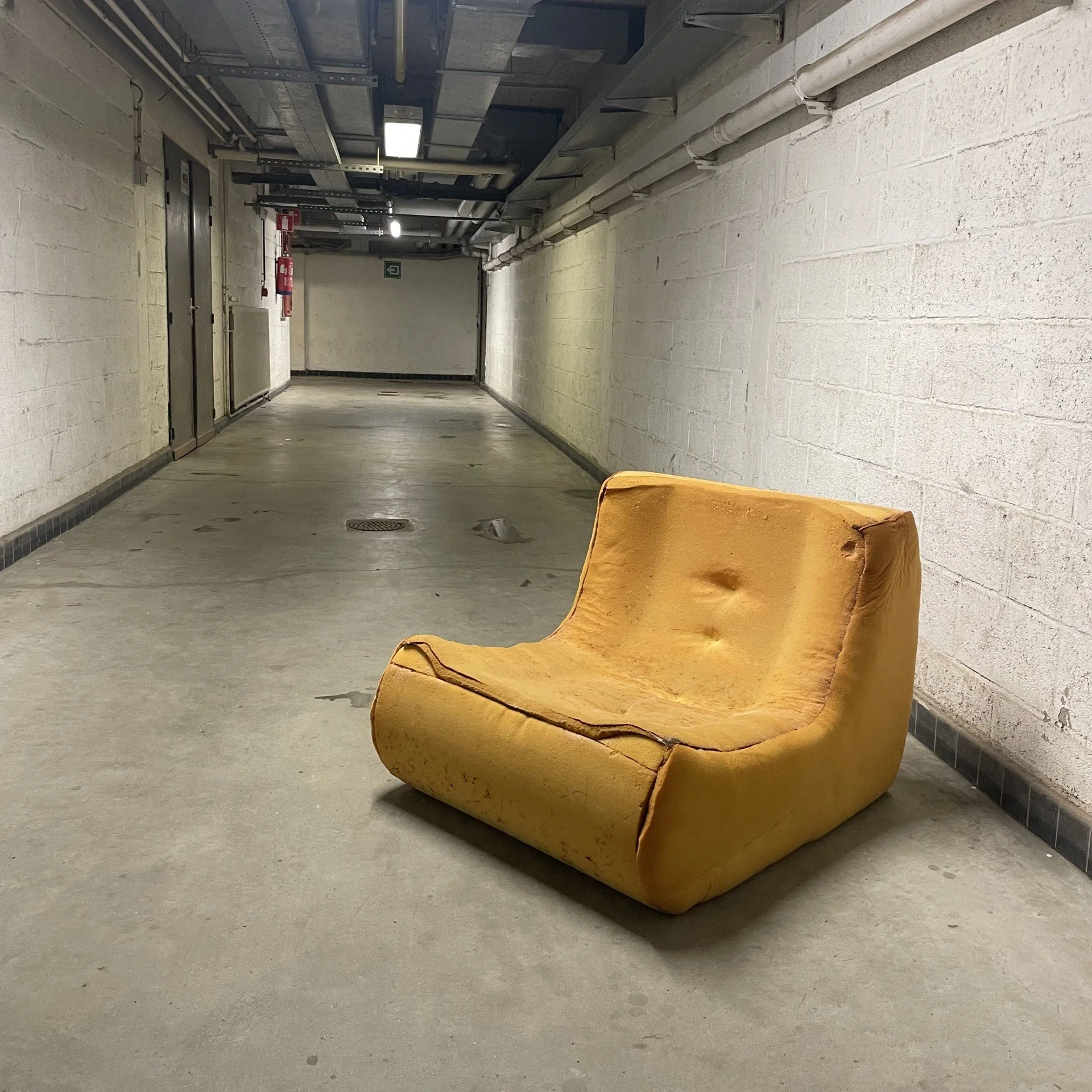 Dit zitbankje kreeg vorm met gerecycleerde materialen (spaanplaat, pvc buizen, restjes mousse en dacron).