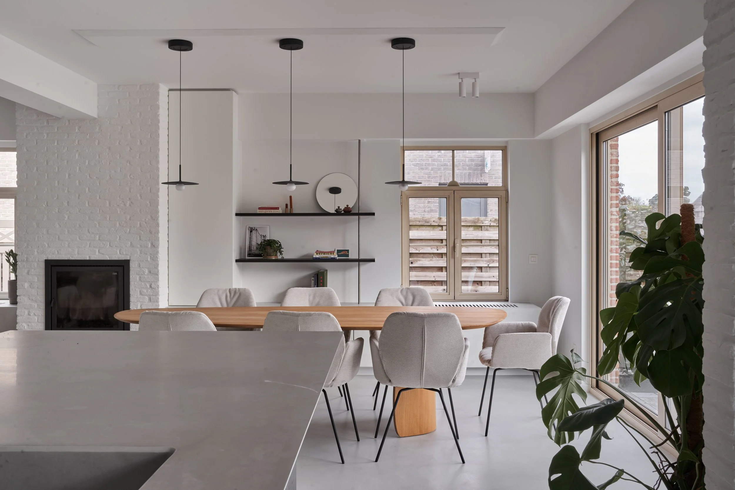 De bestaande indeling blijft behouden, waardoor structurele werken beperkt bleven. Enkel in de keuken wordt het raam dat uitkijkt op de tuin vergroot, om meer lichtinval en een beter zicht naar buiten te creëren.